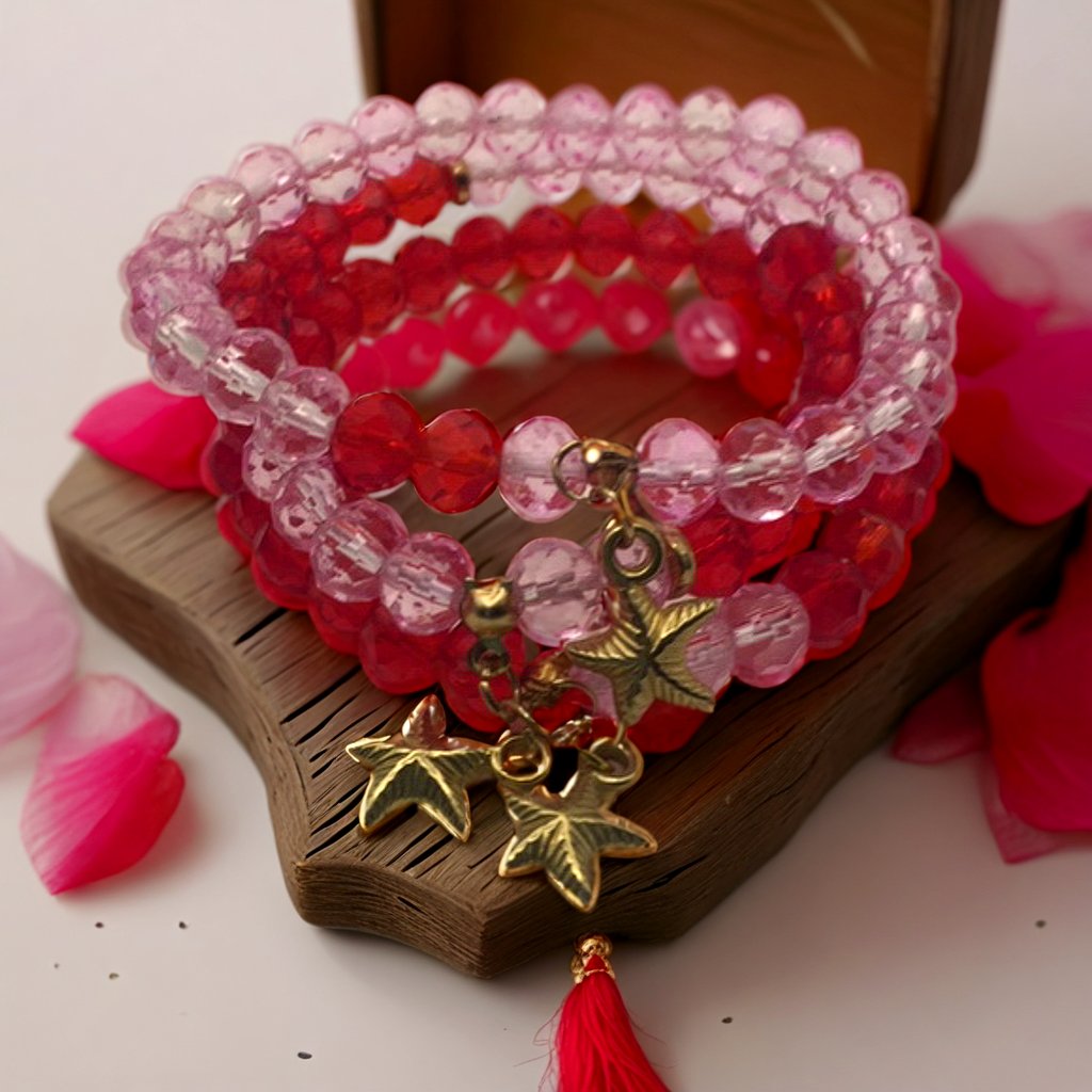 Sweet, feminine, and full of charm—our *Cherry & Pink Glass Beaded Bracelet* features a stunning mix of rich cherry red and soft pink glass beads, beautifully accented with delicate metallic charms. Each charm adds a touch of personality and sparkle, making this bracelet not just a statement piece, but a keepsake. Whether worn solo or stacked, it’s the perfect accessory to add elegance and playful flair to any outfit.
